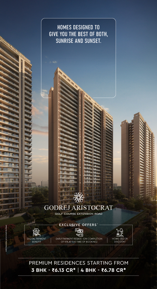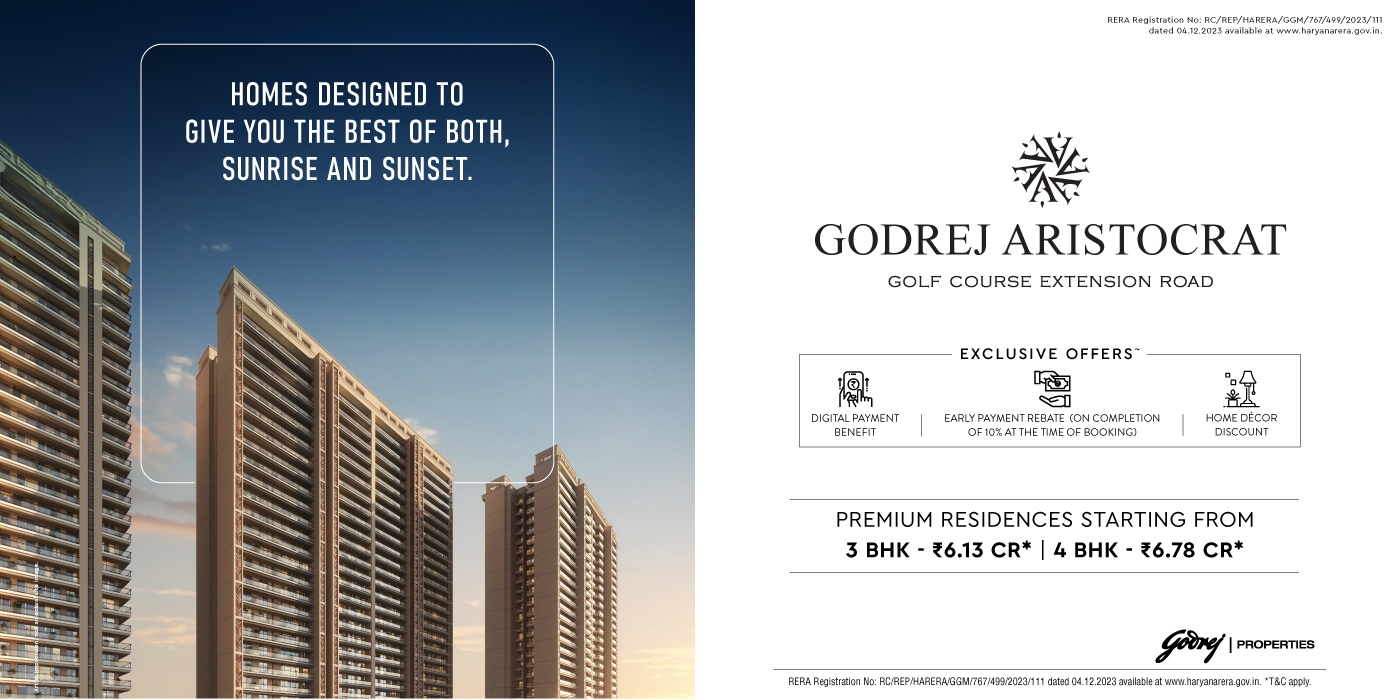 Godrej Properties Limited (“Company”), is developing a residential group housing project/ namely “Godrej Aristocrat” (“Project”) situated at Sector 49, Gurugram, Haryana and registered with Haryana Real Estate Regulatory Authority vide RERA Registration No: RC/REP/HARERA/GGM/767/499/2023/111 dated 04.12.2023 available at www.haryanarera.gov.in. The sale is subject to terms of application form/ allotment letter and agreement for sale executed with the Promoter. All specifications of the apartment shall be as per the final agreement executed with the Promoter. Customers are advised to apprise themselves of the necessary and relevant information of the project prior to making any purchase decisions. This creative is purely conceptual, illustrative, and used for indicative purposes only and not a legal offering. The official website of Godrej Properties Limited is www.godrejproperties.com. Please do not rely on any other website.